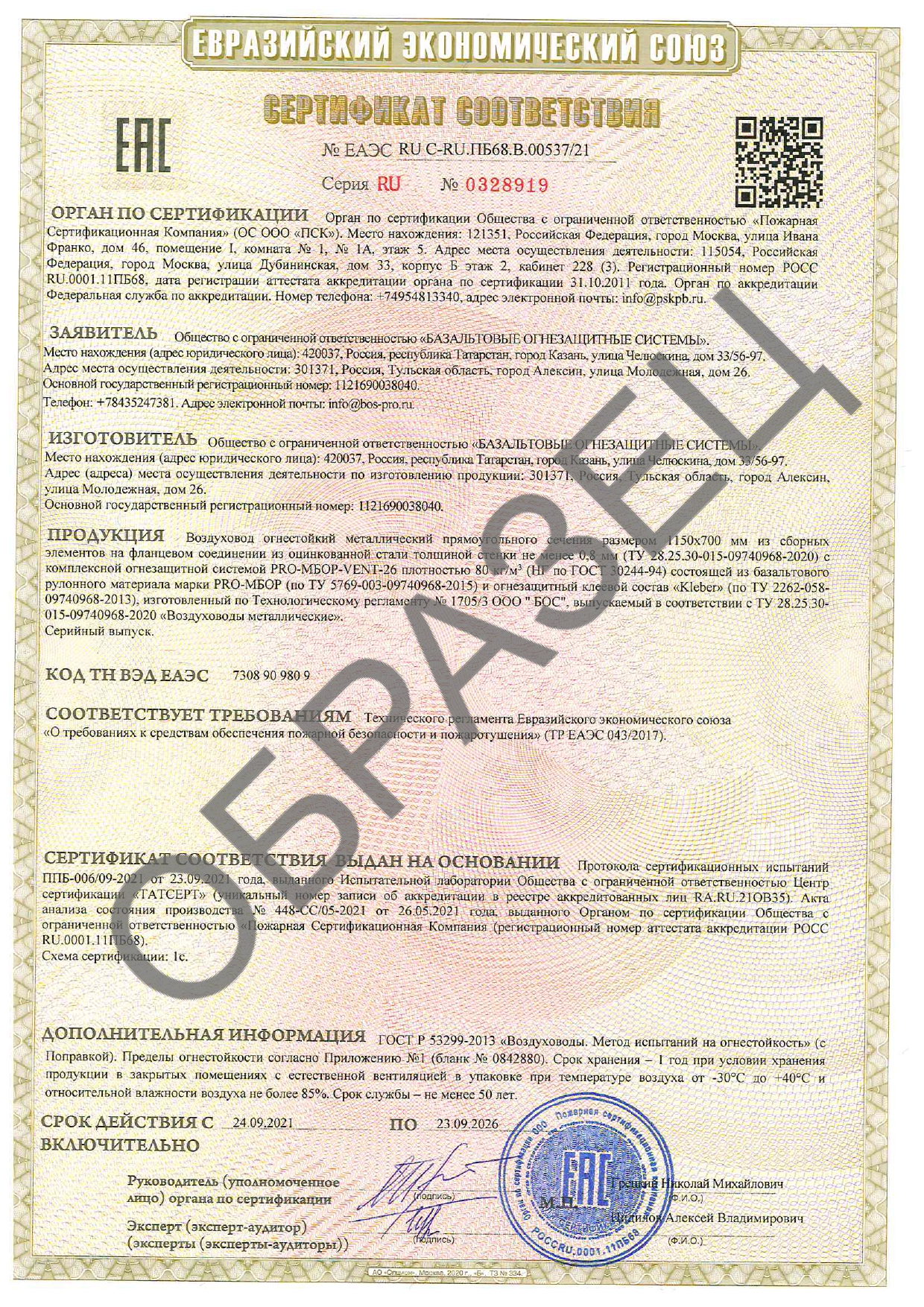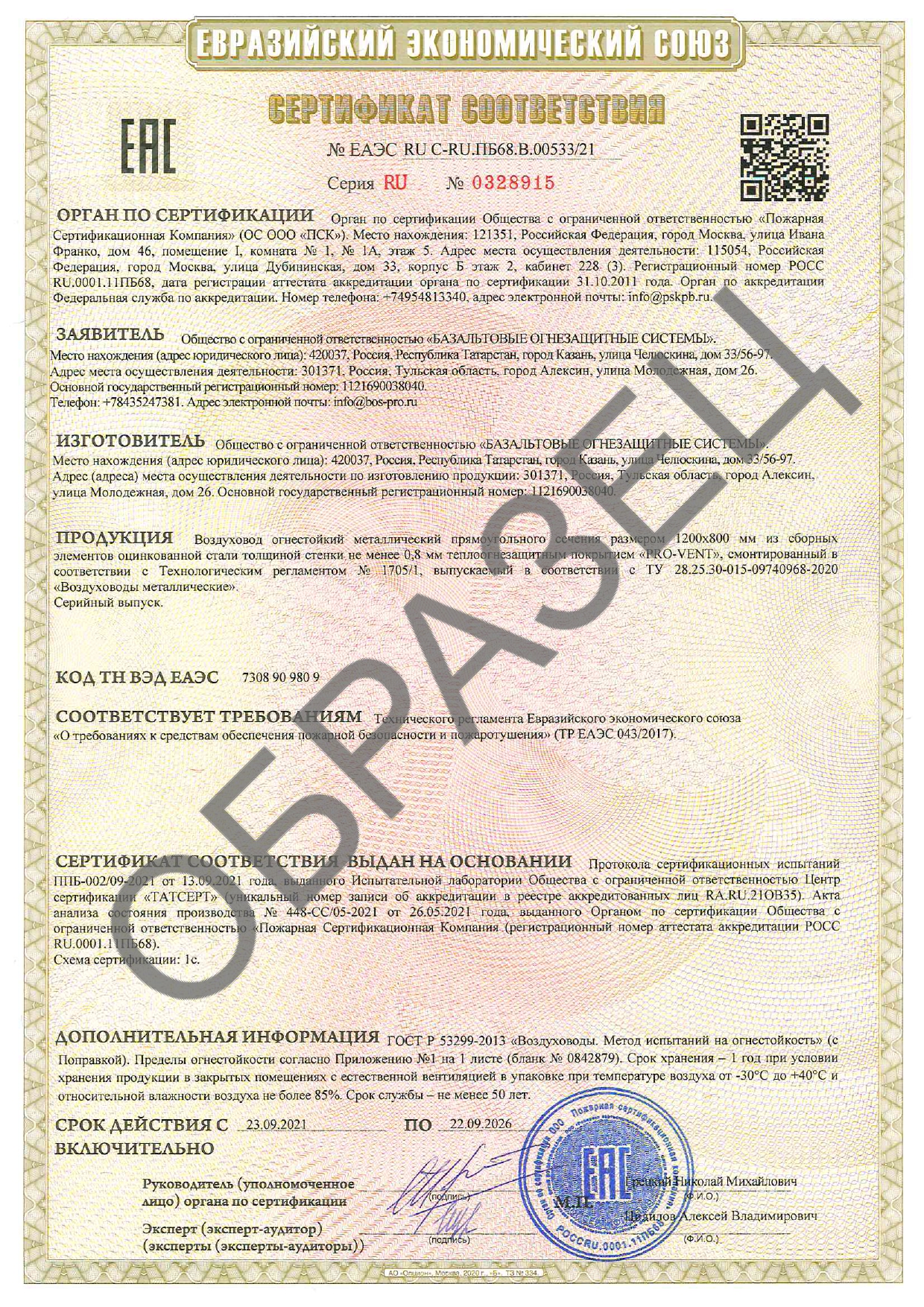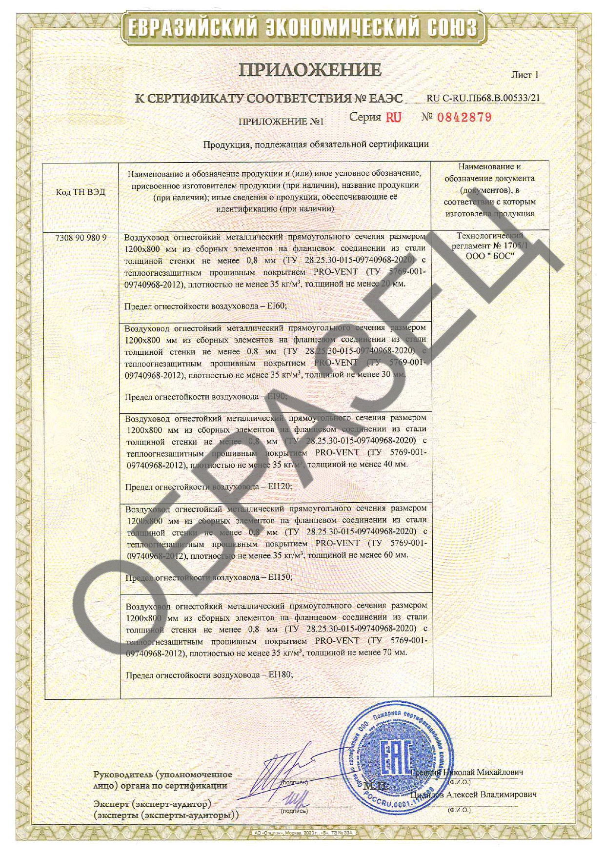 Пожарные сертификаты соответствия пределам огнестойкости покрытий для воздуховодов и систем дымоудаления (EI 30, EI 60, EI 90, EI 120, EI 150, EI 180 EI 240)