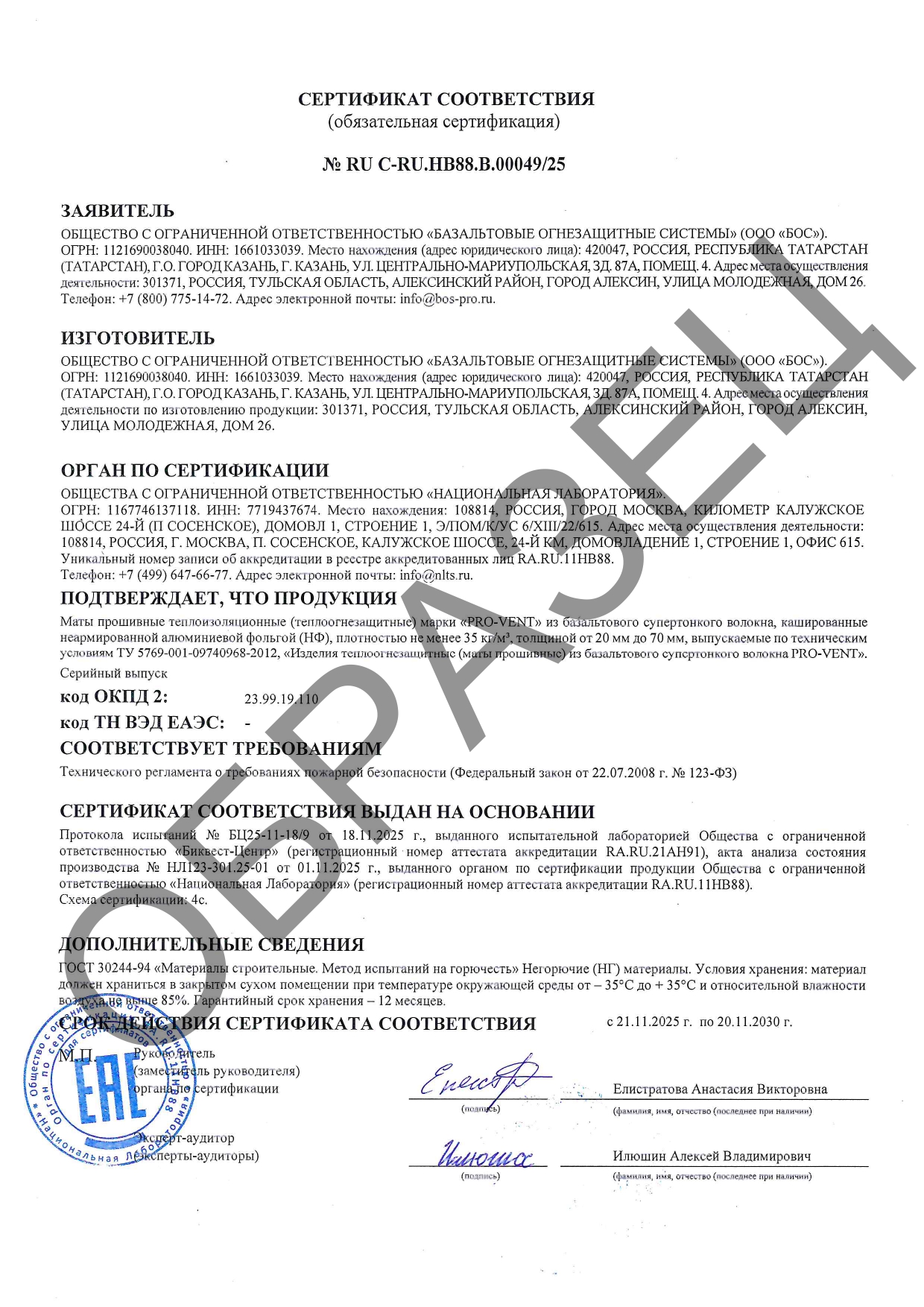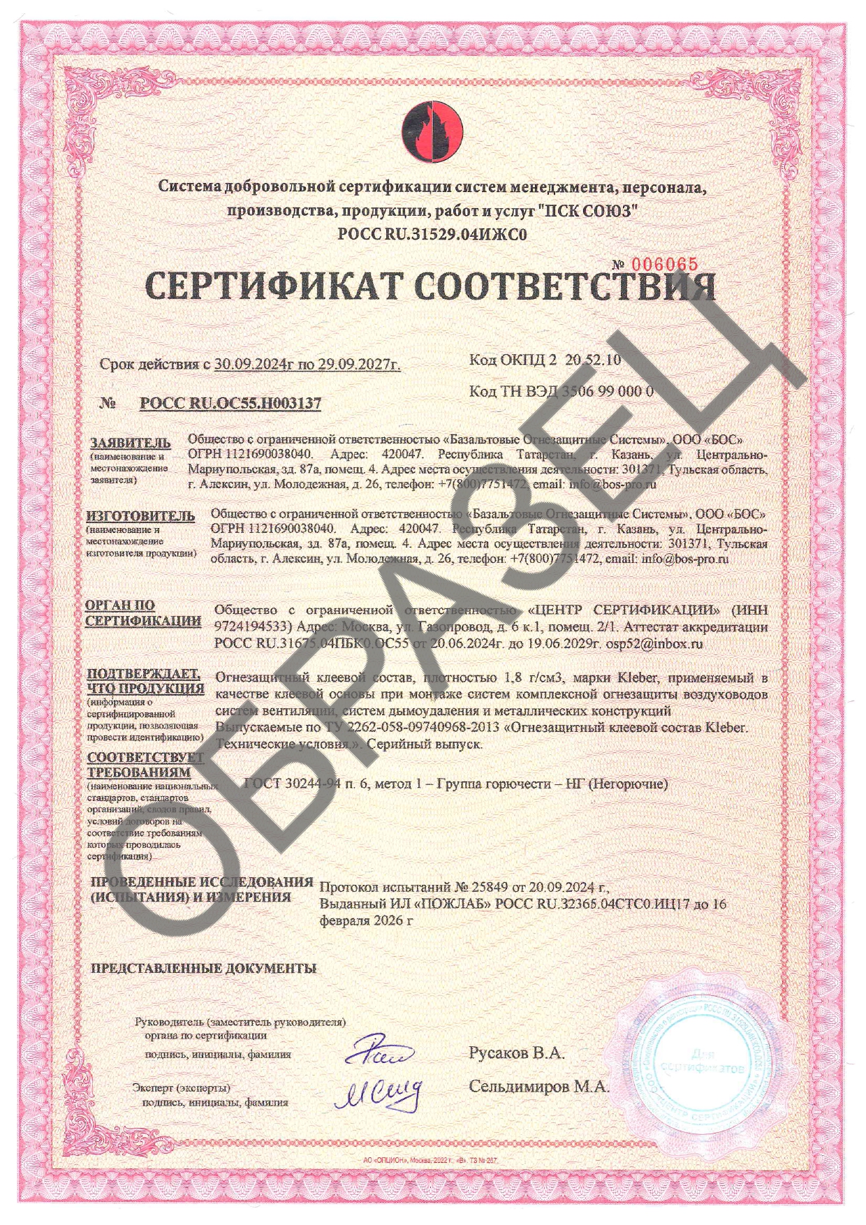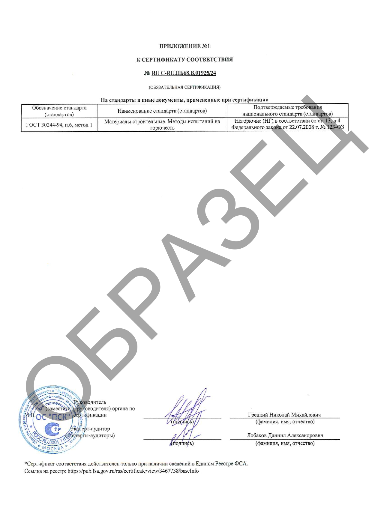 Сертификат соответствия о требованиях пожарной безопасности (на негорючесть) по ГОСТ 30244-94.
