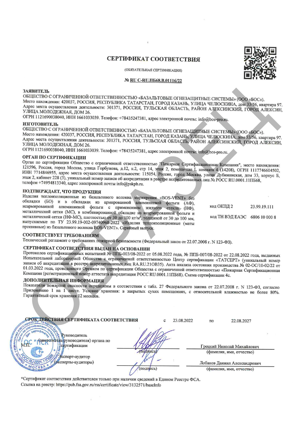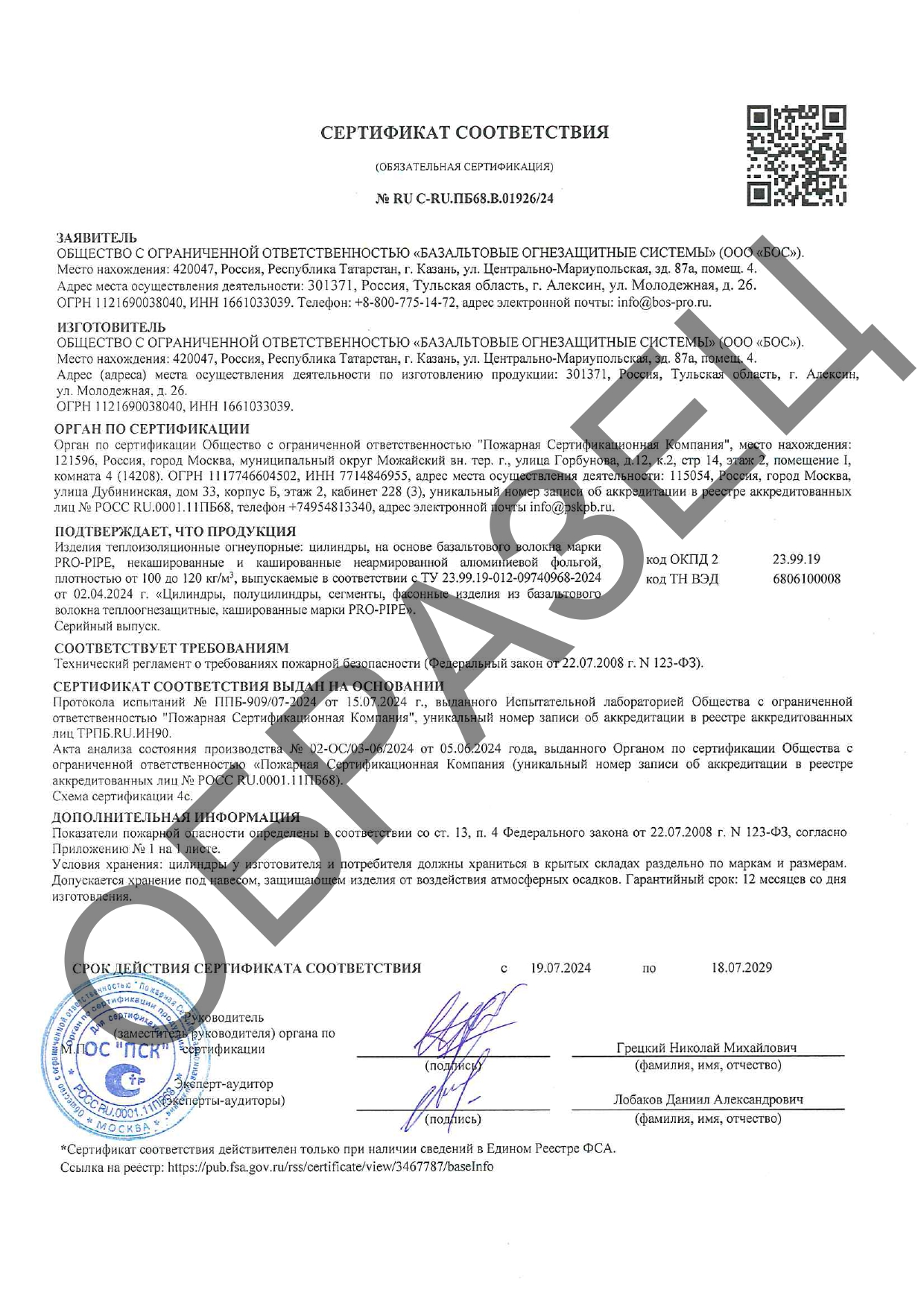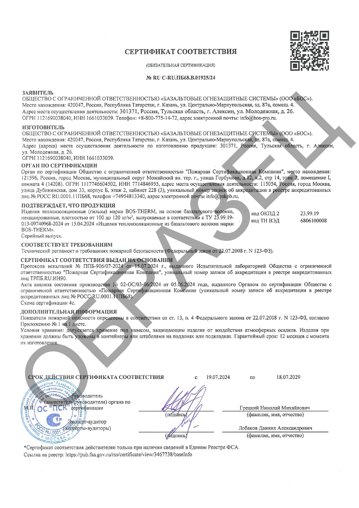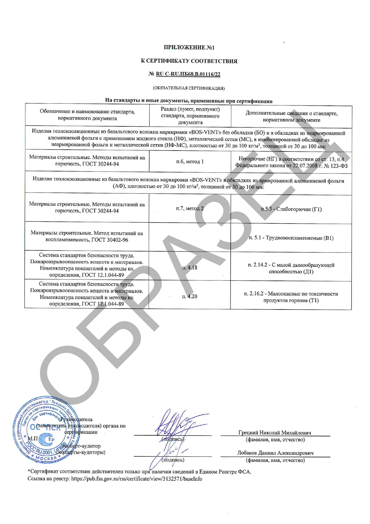 Сертификат соответствия о требованиях пожарной безопасности (на негорючесть) по ГОСТ 30244-94.
