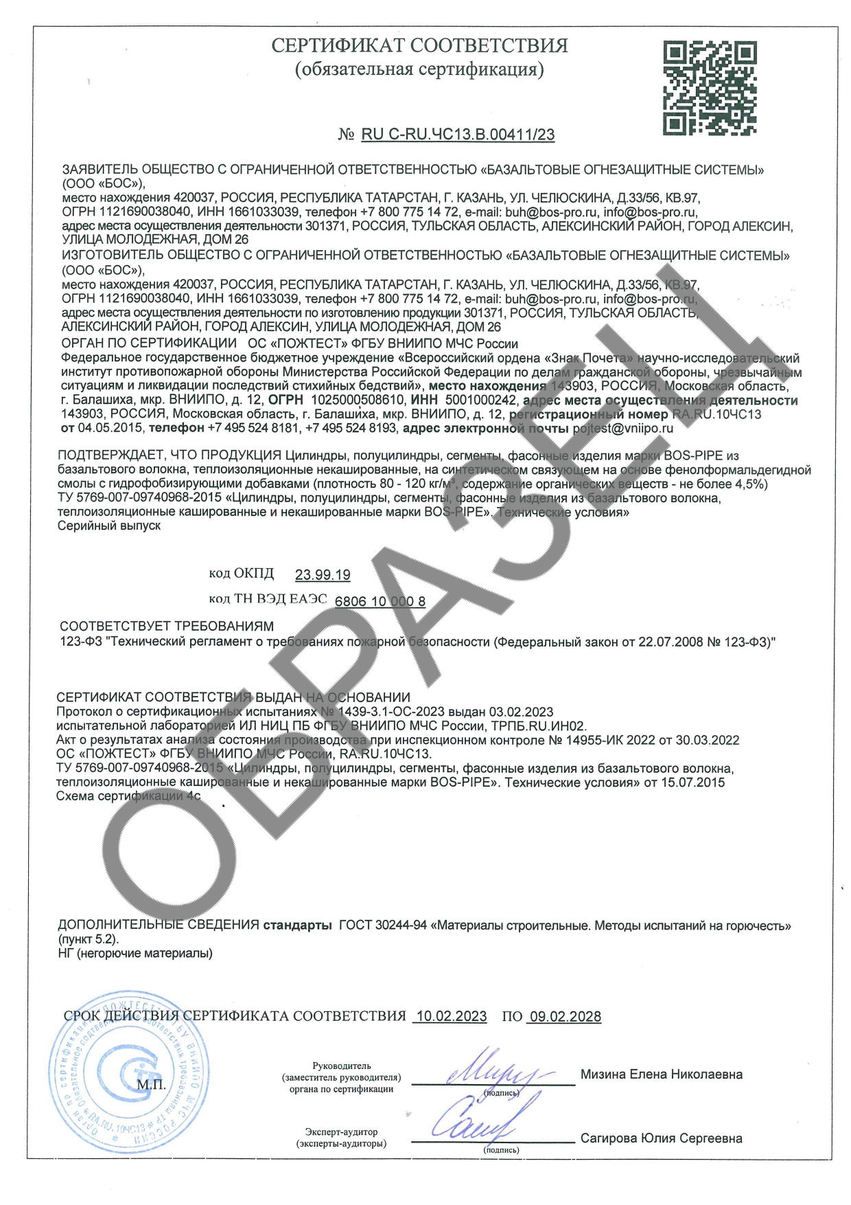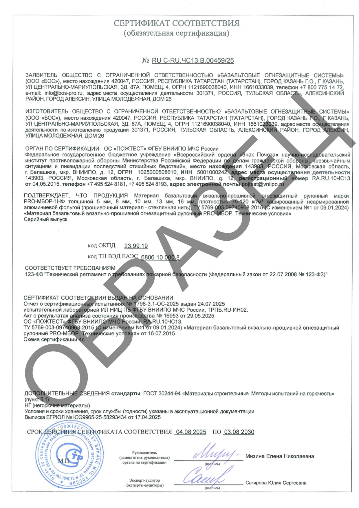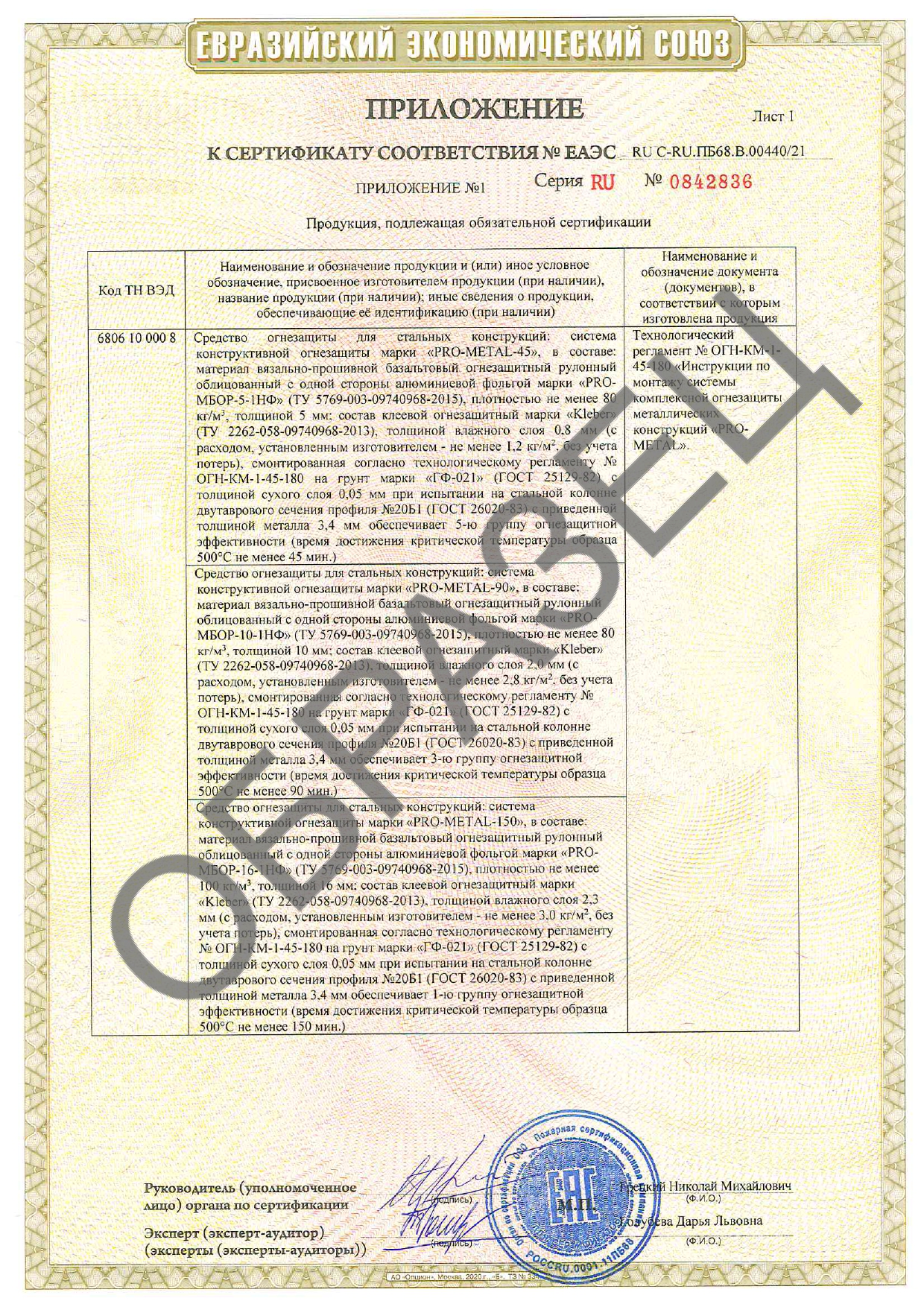 Сертификаты соответствия о требованиях пожарной безопасности испытаний на огнестойкость по ГОСТ 53299-2013.
