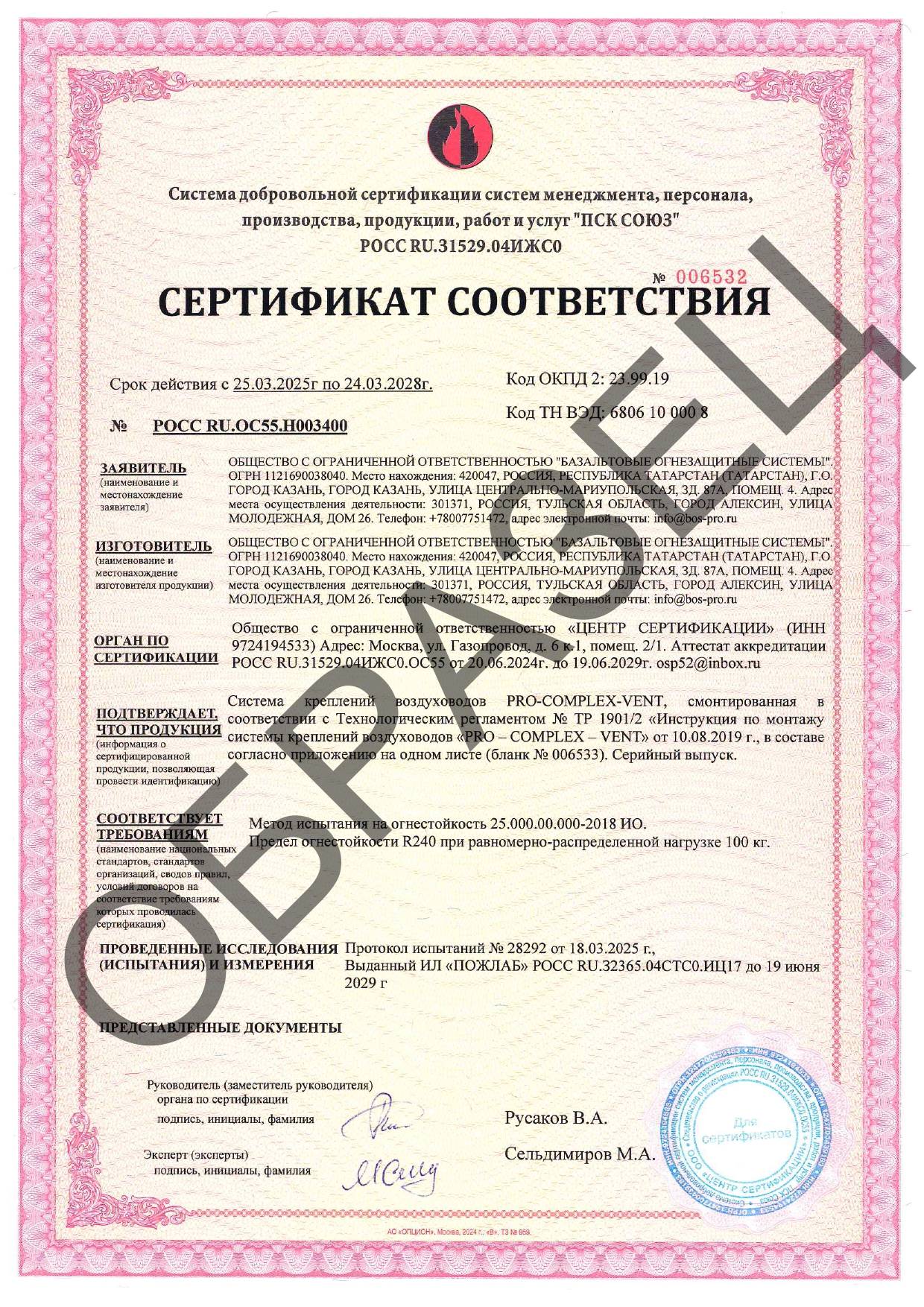 Сертификат соответствия о требованиях пожарной безопасности на огнестойкость (предел огнестойкости R180) на системы PRO-COMPLEX-VENT.