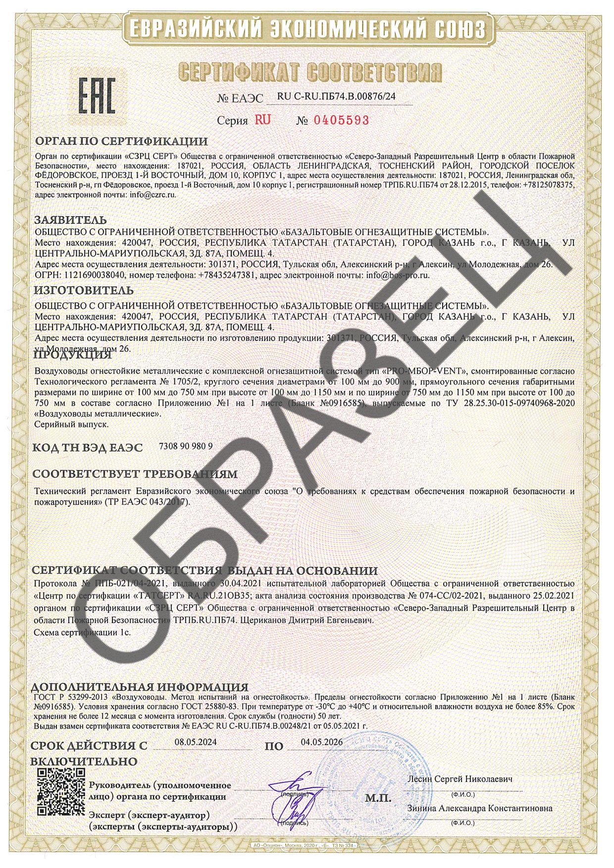 Сертификат соответствия о требованиях пожарной безопасности на огнестойкость (предел огнестойкости R180) на системы PRO-COMPLEX-VENT по ГОСТ 25880-83.
