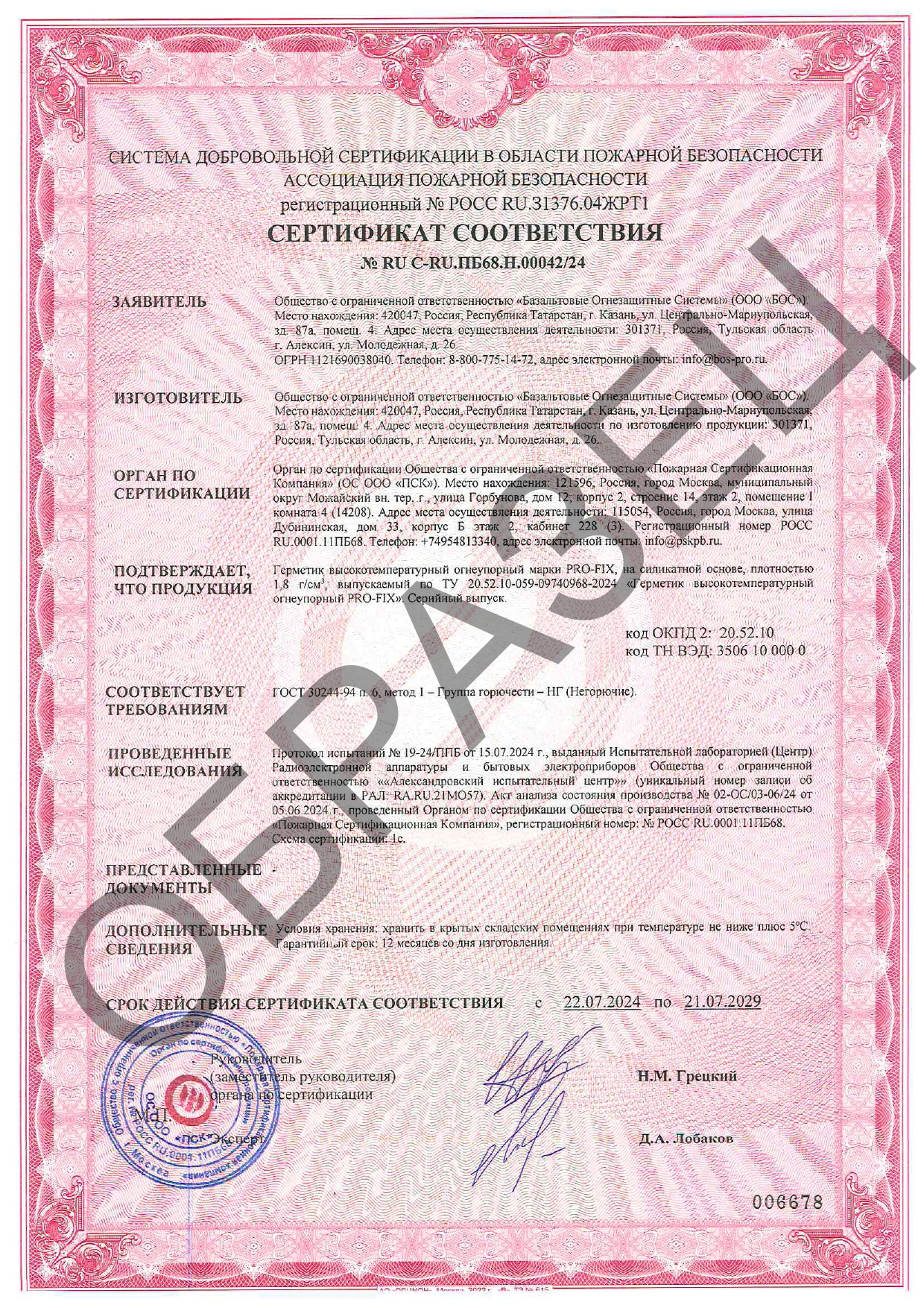 Сертификат соответствия о требованиях пожарной безопасности испытаний на огнестойкость по ГОСТ 30247.1-94.