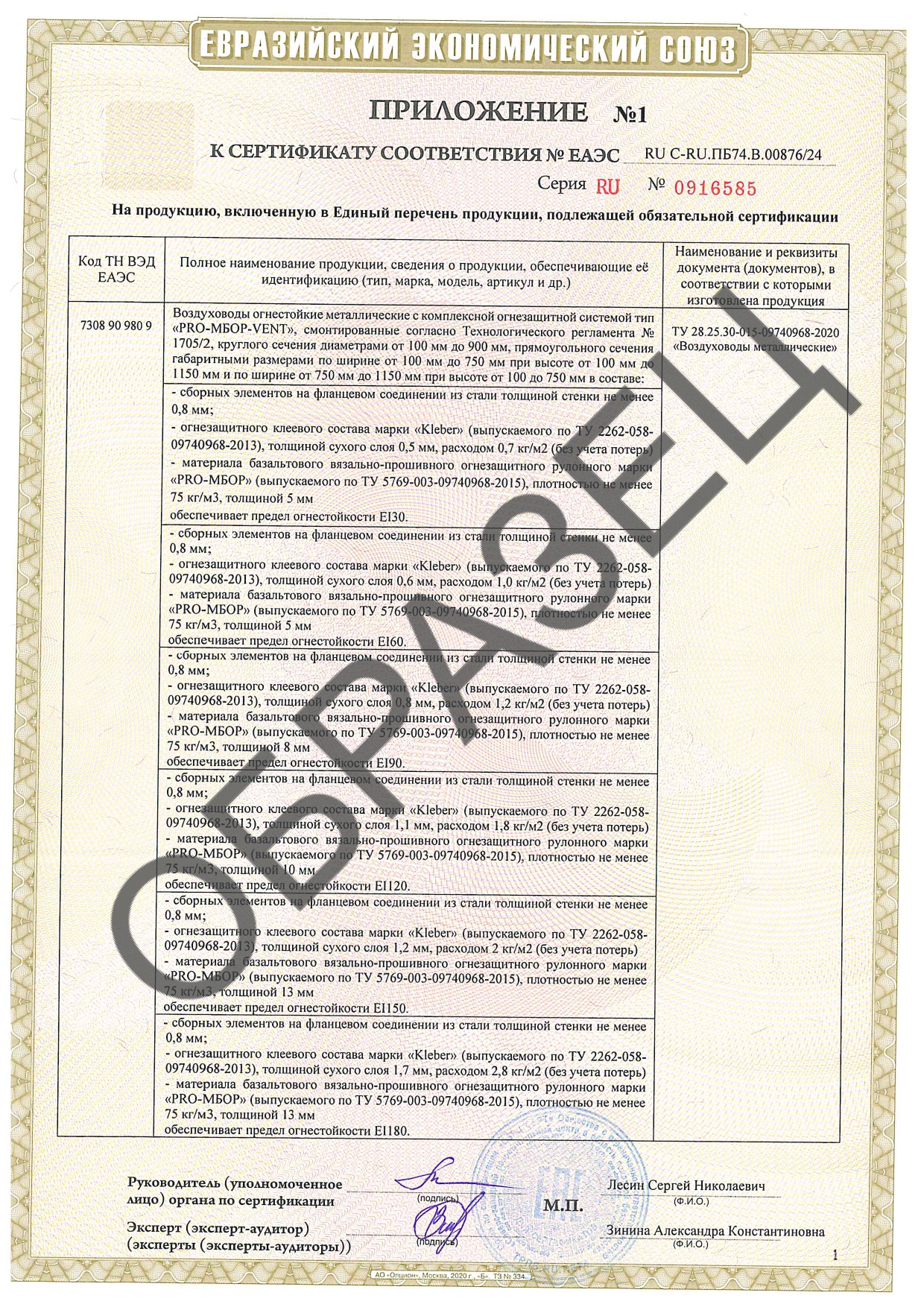 Система PRO-МБОР-VENT соответствует Техническому регламенту о требованиях пожарной безопасности (Федеральный закон от 22.07.2008 № 123-ФЗ, в ред. От 13.07.2015 г.) глава 31., статья 138., п. 1. И ГОСТ Р 53299-2013 «Воздуховоды. Методы испытаний на огнестойкость».